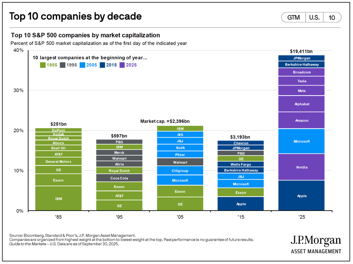 The top 10 companies in the S&P 500 have continuously evolved over the years. From oil, manufacturing, and consumer staples…to digital manufacturing. It will be fascinating to see what comes from the next 10 years of this AI revolution. Via J.P. Morgan Asset Management.