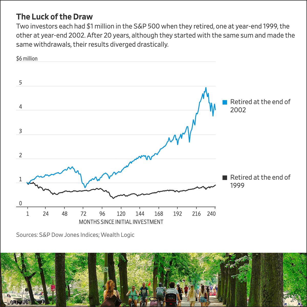 In Jason Zweig’s article “Should You Just Buy Stocks Until You Die?“, he says luck plays an important role in investing. See below his graph comparing two identical investors with totally different outcomes based on the date they retired. Via Contessa Capital Advisors.